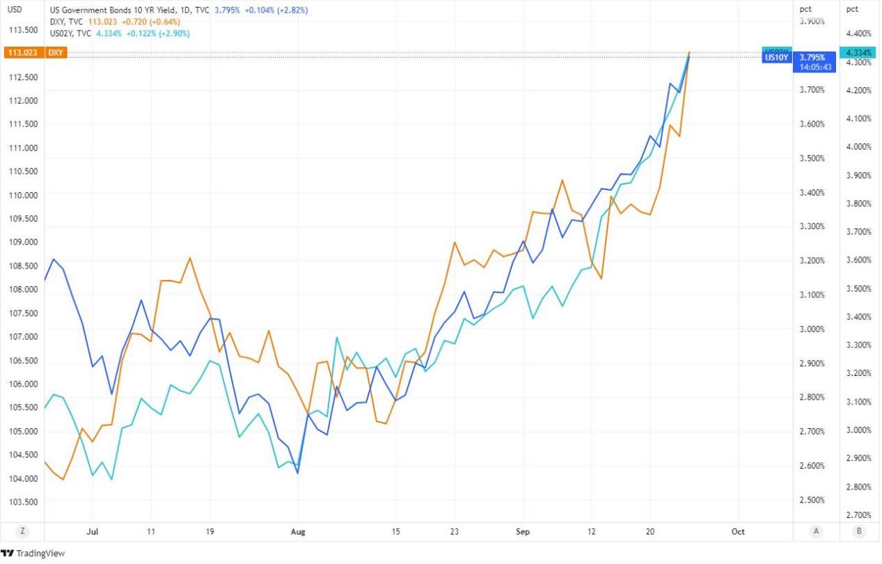 正常情况下,当股票下跌时,投资者会寻求固定收益的安全港;这意味着债券价格会上涨,而收益率相应会下降(反之亦然)。然而,上周美国国债继续下跌,美国国债收益率再次飙升,其中对美联储加息最敏感的2年期美债收益率,上周五一度升至4.268%;而被视为基准的10年期美国国债收益率则触及3.829%高位。日内,2年期美债收益率再创新高,至4.349%。