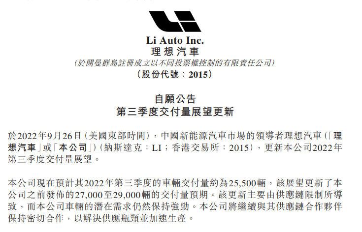 财联社9月26日电,理想汽车称预计第三季度车辆交付量约为25,500辆,此前交付量预期为27,000至29,000辆。理想汽车称该更新主要由供应链限制所导致,公司车辆的潜在需求仍然保持强劲。