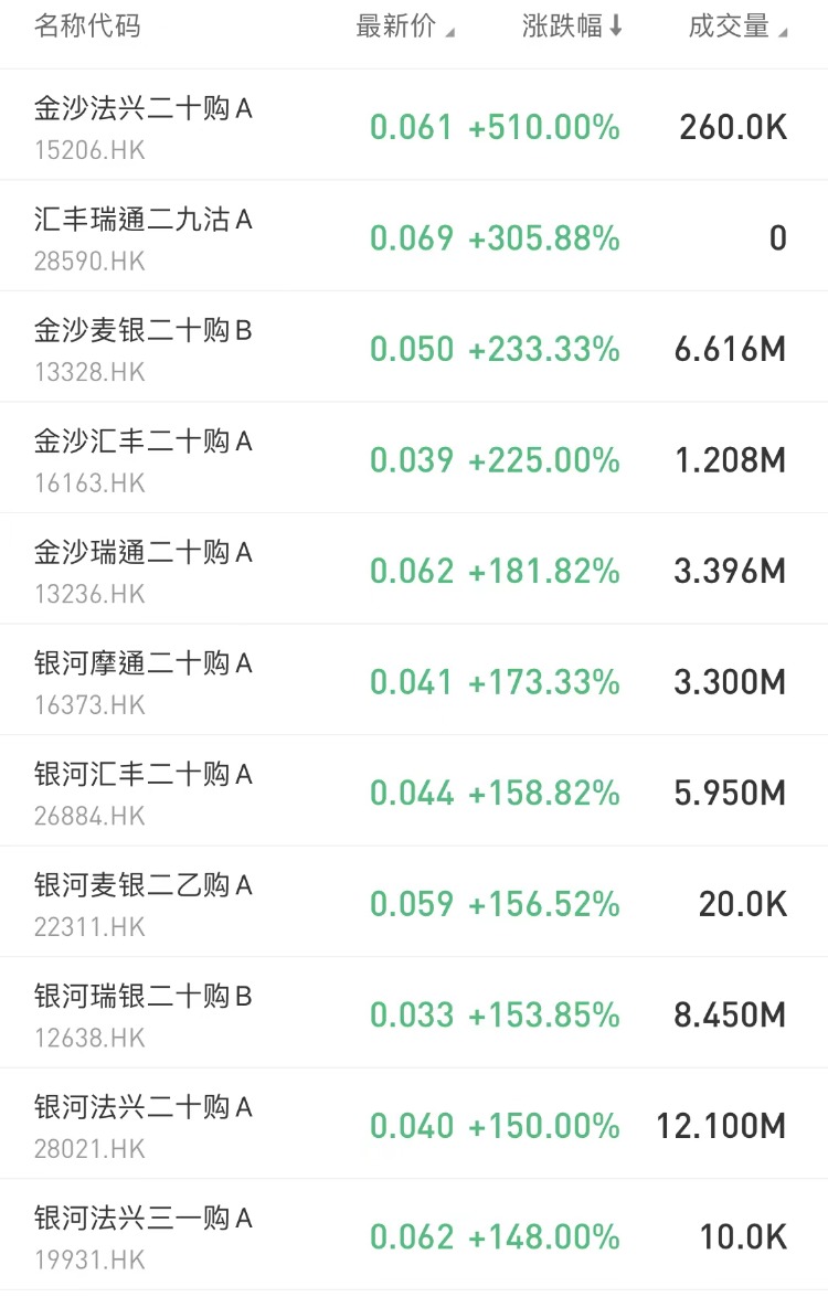 在今日涨幅榜中,金沙法兴二十购A $15206.HK 涨510%,银河摩通二十购A $16373.HK 涨173.33%,此外,腾讯高盛二十牛D $59288.HK 涨138.46%。