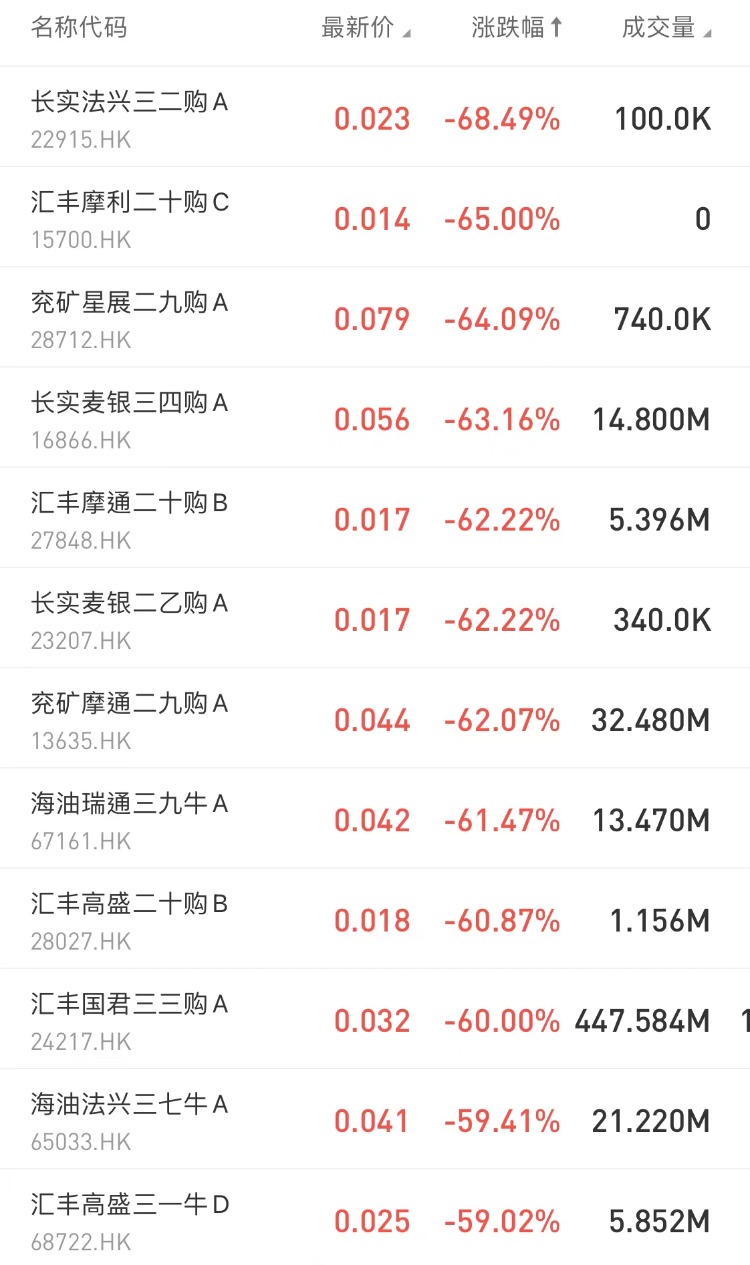 在今日跌幅榜中,长实法兴三二购A $22915.HK 跌68.49%;兖矿星展二九购A $28712.HK 跌64.09%。