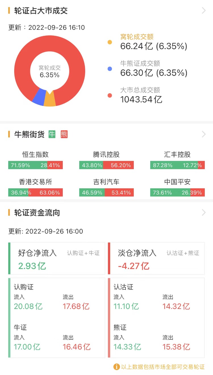 其中,窝轮总成交额为66.24亿港元,牛熊证总成交额为66.3亿港元。