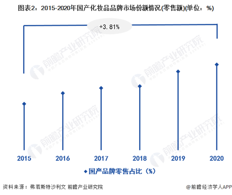 根据弗若斯特沙利文统计数据,以零售额计的中国化妆品市场中,国产品牌市场份额不断上升,2020年国产品牌市场份额达到46.30%。