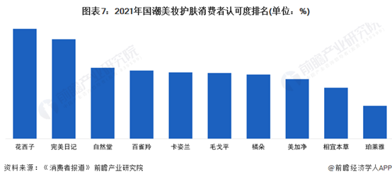 根据2021年10月《消费者报道》发布的调研统计数据,在国潮美妆护肤领域,花西子、完美日记、自然堂的消费者认可度位列前三,分别占比39.2%、35.5%、25.3%。紧随其后的是百雀羚、卡姿兰、毛戈平、橘朵,占比均在23%-24%左右。