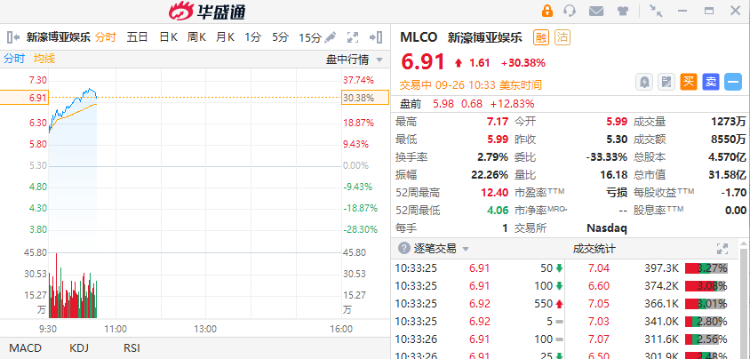 美股濠赌股普涨,新濠博亚娱乐大涨30%,永利度假村涨近14%,金沙集团涨6超12%,消息面上,澳门决定恢复内地旅客电子签注及旅行团。