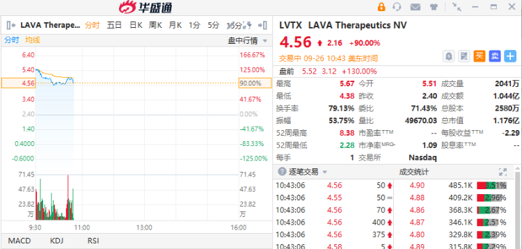 荷兰生物技术公司LAVA Therapeutics暴涨90%,报4.56美元,此前该公司与Seagen宣布达成全球独家许可协议,推进LAVA-1223,该药用于治疗表皮生长因子受体(EGFR)表达的实体肿瘤。