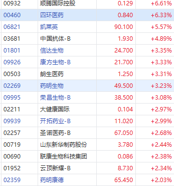华盛资讯9月27日消息,港股制药与生物板块今日反弹,四环医药涨超6%,凯莱英、中国抗体涨超5%;荣昌生物-B、康方生物-B、药明生物涨超3%;信达生物、开拓药业-B涨超2%。