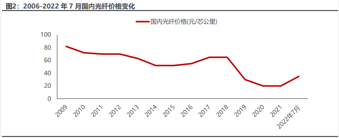 但事实上,自2021年开始行业又再度迎来拐点,电信运营商对光纤光缆需求有了明显回升。2021年中国移动普缆招标均价达到约64.9元/芯公里,较2020年40.9元/芯公里涨幅超过50%,且海内外散纤价格同样明显回升,2022年7月欧洲市场已经达到6.3美元/芯公里,而去年Q3时价格还不到4美元/芯公里。