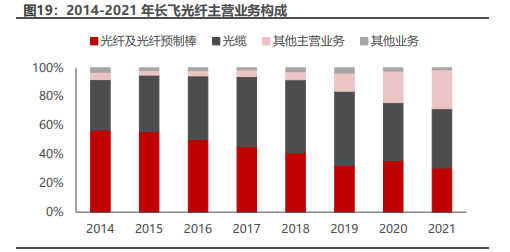 公司多年来立足于光纤光缆业务,棒、纤、缆业务收入比重稳定保持在70%以上。但经过19年行业低谷期后,公司持续完善多元化布局,逐渐进入光模块及光器件、AOC、海上风电、半导体材料等领域,2021年其他业务收入占总营收比例已经高达27%。