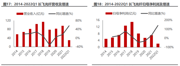 到2022年上半年,三大运营商集采量价齐升,长飞当期营收达到29.82亿元,同比增长了55.95%,归母净利润2.94亿元,同比增长141.03%,显示行业再度进入高景气度,而公司的高成长性也得以显现。