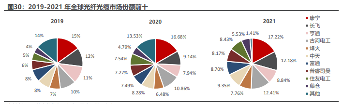 而长飞光纤掌握的“PCVD+RIC”光纤预制棒生产技术处于世界领先水平,也是其主要的光纤预制棒生产方式。由于较高的壁垒,全球光纤光缆行业份额主要集中在拥有光纤预制棒自研技术的企业,寡头垄断格局明显。