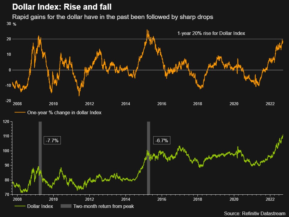 飙升的美国利率、相对强劲的美国经济以及资产价格剧烈波动引发的避险需求吸引了投资者买入美元,推动美元兑一篮子货币在过去一年上涨约22%。然而,一些投资者越来越担心美元交易变得过于拥挤,如果持有该货币的理由发生变化并且投资者试图一次性全部平仓,美元可能会出现突然逆转。