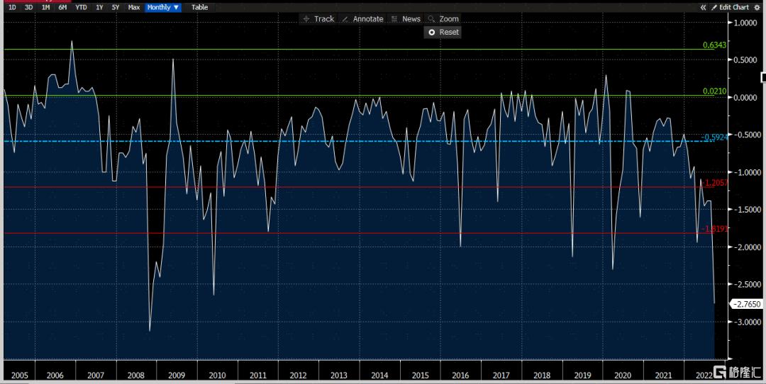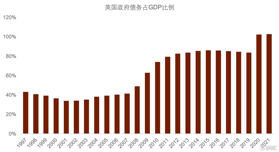 虽然在特拉斯9月初上任初期,市场就对其一直主张的依靠大幅额外政府发债以及削减各项税收来进行财政刺激的政策有所预期(详见《英国新首相上任的汇率影响》)但周五公布的减税计划的巨大规模是自1972年Ted Health担任首相以来最大规模的减税措施。而投资者对当时的预算案导致通胀失控,进而引发英国此后陷入衰退,而之后花费了整整10年时间,才最终以1976年英国求助了IMF外部援助才得以结束依然记忆犹新。更何况,在这一减税计划推出之前,英国就已经面临了一个典型的发展中国家才会面临的“双赤字”难题:即“财政+贸易”赤字达到了2500亿英镑,而单单是后者就已经在今年一季度占比GDP达到1997年以来的最高水平8.3%,而21年这一比例就已经达到102%(图2)。