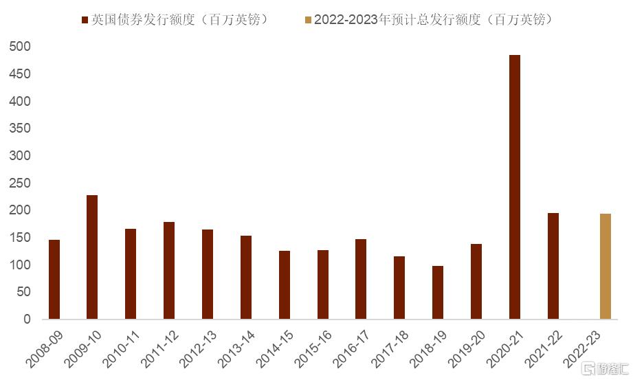 如此大额的减税计划意味着此后英国不得不大规模发债来维持其政府运作(英国需要额外发行620亿英镑国债,图1)而这也使得市场开始对英国政府的债务可持续性产生了担忧,尤其考虑到目前面临严峻的通胀压力,BOE正处于加息周期之中,而这也就使得英国政府的偿债压力进一步加剧。此外更重要的一点是,BOE为了实现其控制通胀的目标而进行大幅收紧货币政策,这样做大概率会带来经济的下行风险,而这就和新政府推出的经济增长计划出现了根本的分歧。在此背景下,资产价格出现了我们看到的走势:英国国债因政府将要扩大发债规模支持财政因而大幅下跌(国债收益率大涨),而英镑并未受到国债收益率上行的支撑,反而因市场担忧BOE理论上可能会配合财政扩张而淡化通胀目标(比如放缓加息)进而承压大幅走低。