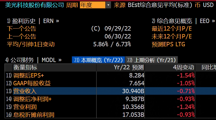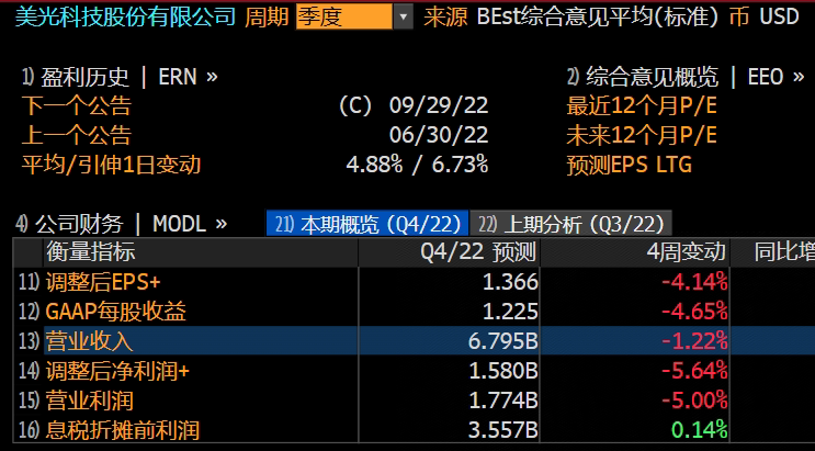 根据彭博分析师预期,美光科技第四季度营收67.95亿美元,同比下滑17.88%;经调整后净利润15.8亿美元,同比下滑41.91%;调整后EPS为1.366美元,同比下滑42.85%。