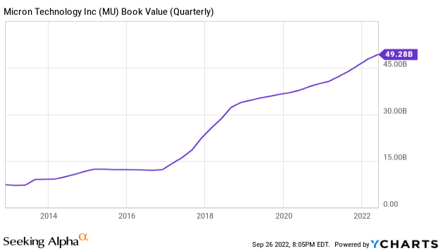 Albano复盘美光科技以往股价走势和市净率,该股曾在2018年低谷时期短暂跌破账面价值。假如周四财报显示美光的账面价值回到44美元,则相对于2018年底部回报率56%,年化12.5%。换言之,若以账面价值买入该股,即使在最糟糕的情况下仍然获得年化12.5%的收益。而从历史走势看,即使营收利润波动,市盈率回调,但账面价值却在螺旋式上行。