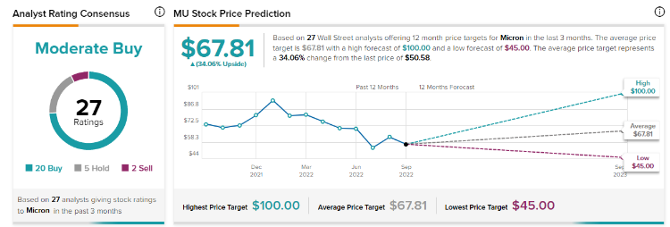 根据Tipranks的统计,27位分析师对美光科技进行了评级,其中20位给予“买入”评级,5位给予“持有”评级,2位给予“卖出”评级,平均目标价67.81美元,较周二收盘价有34.06%的上涨空间。