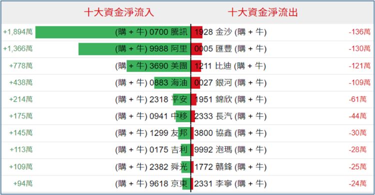 好仓(认购证及牛证)方面,周二腾讯、阿里、美团等相关好仓单日分别获得1894万港元、1366万港元、778万港元资金净流入;金沙中国、汇丰、比亚迪分别获得136万港元、130万港元、121万港元资金净流出。