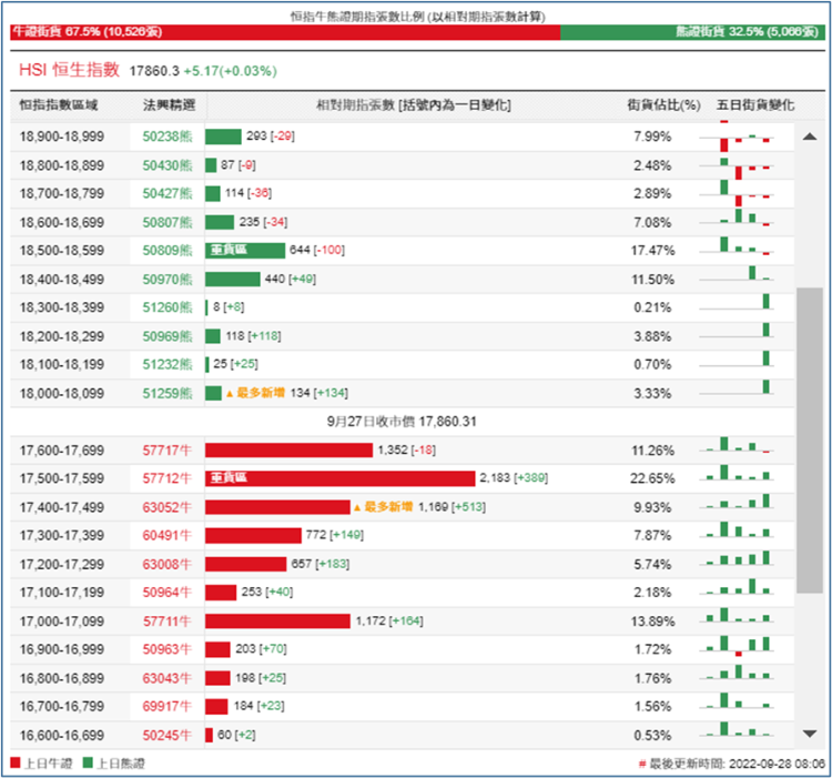 街货分布方面,至周二,恒指牛证街货重货区间主要在收回价17400点至17700点之间,累计相当约4704张期指合约;恒指熊证街货重货区主要在收回价18400点至18700点,累计相当约1319张期指合约。