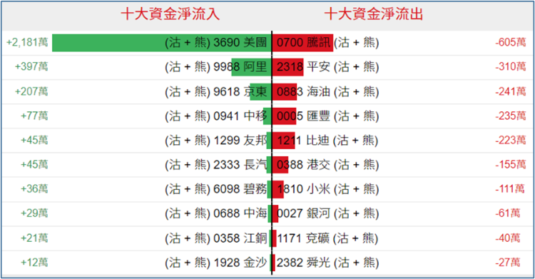 淡仓(认沽证及熊证)方面,周二美团、阿里、京东相关淡仓单日分别获2181万港元、397万港元、207万港元资金净流入,腾讯、平安、海油等相关淡仓单日分别获605万港元、310万港元、241万港元资金净流出。