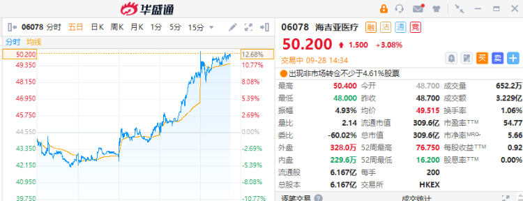 另外,9月26日,海吉亚医疗的股价(以下均指前复权)上涨4.56%,9月27日,其股价更是大涨了8.83%,报收48.7港元/股,两日累涨13.79%,且成交量有所放大。