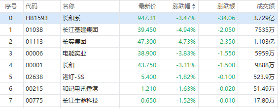 英镑持续走弱,拖累英资银行和长和系下行。截至发稿,汇丰控股(00005)跌4.24%,报40.65港元;渣打集团(02888)跌3.2%,报48.4港元;长实集团(01113)跌3.73%,报47.8港元;长和(00001)跌3.54%,报43.65港元。