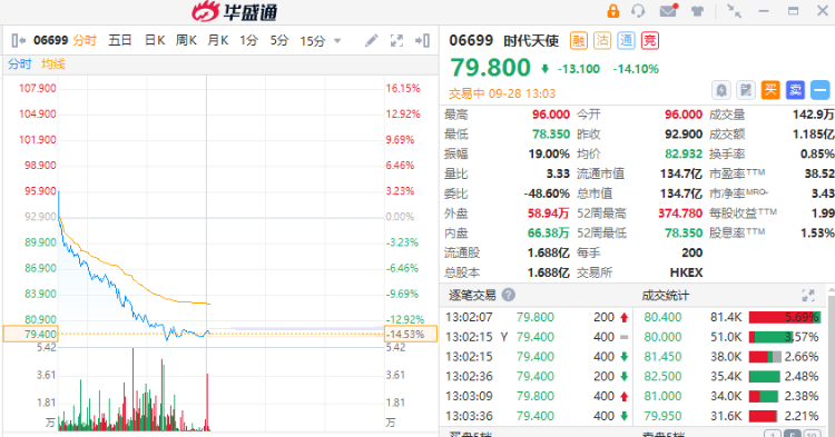 时代天使(06699)股价持续下探,盘中创历史新低,最新报79.80港元,跌14.10%,成交额1.185亿港元。该股9月以来累计跌幅超40%。