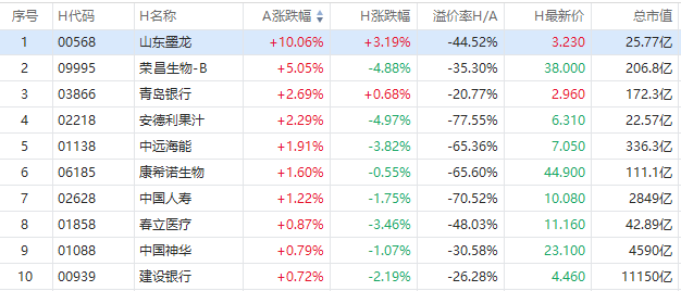 截至发稿,山东墨龙A股涨停,H股现涨3.19%;荣昌生物A股涨5.05%,H股现跌4.88%;青岛银行A股涨2.69%,H股现涨0.68%。