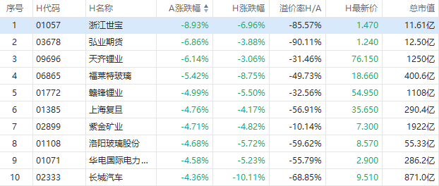 浙江世宝A股跌8.93%,H股现跌6.96%;弘业期货A股跌6.86%,H股现跌3.88%;天齐锂业A股跌6.14%,H股现跌3.06%。
