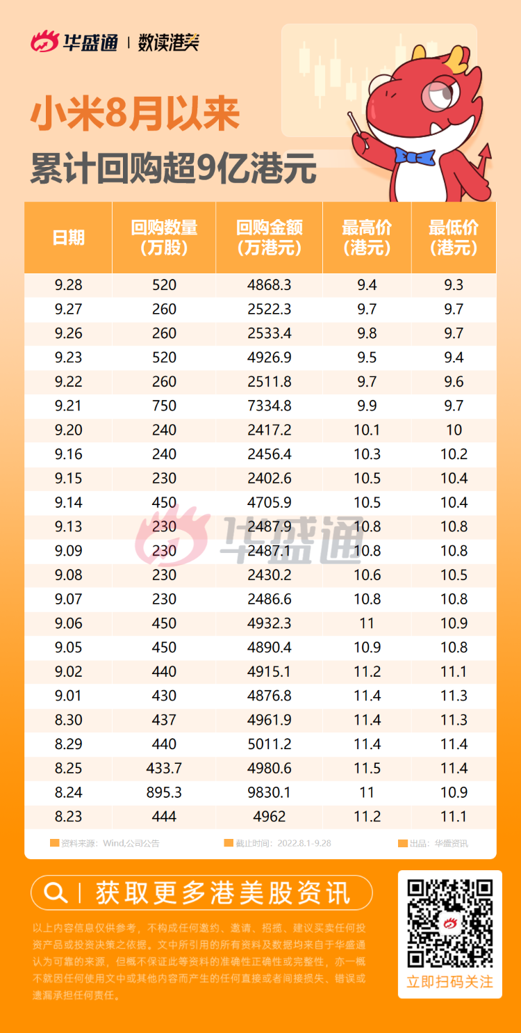 9月28日,小米集团-W继续出手回购520万股,每股作价介乎9.3-9.4港元,回购金额约4868.3万。