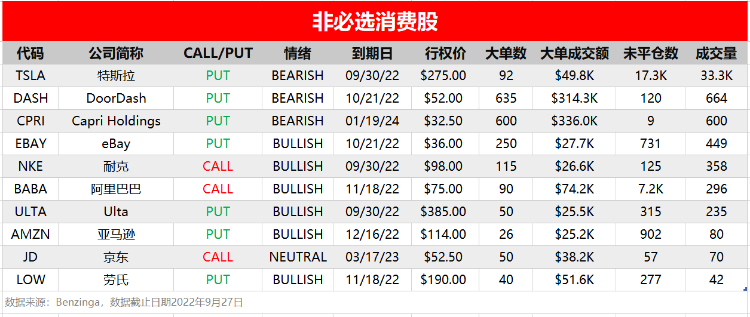 重点动态:物流配送企业DoorDash于10月21日到期、行权价52美元的看跌期权出现一笔大单交易,成交635张,总成本31.4万美元。成交明细显示,该PUT大单被碎单主动买入,显示对后市看空情绪。