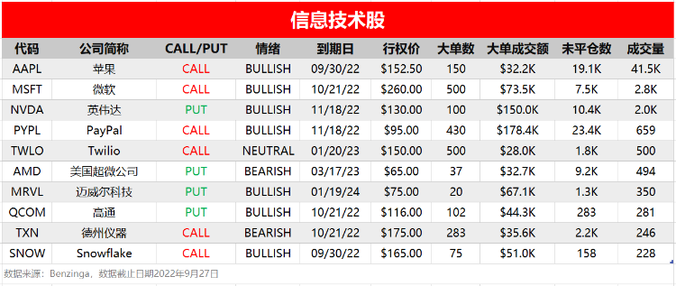 周二(9月27日),非必选消费、信息技术和金融板块相关个股出现较多活跃单,按照当日成交量排行,榜单TOP 10分别如下: