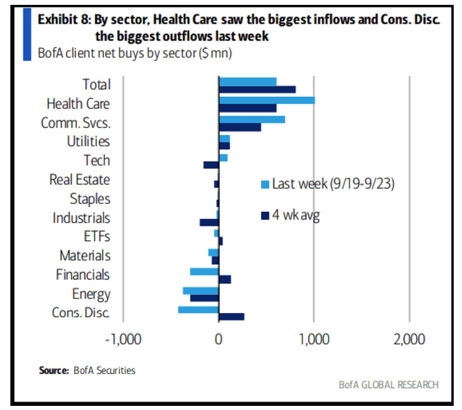 美国银行最新的资金流动数据显示,随着美股持续下跌,投资者涌入防御板块,正以2008年以来最快的速度买入医疗保健股。该银行客户上周净流入美股的资金达到5亿美元,并且集中在医疗保健板块,已连续六周向该板块增加资金。