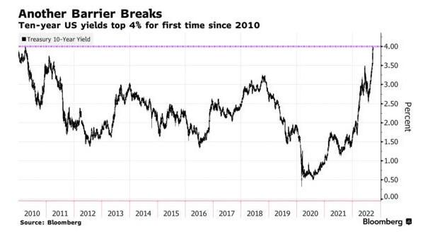 4、全球掀起债券抛售潮 10年期美债收益率涨超4%