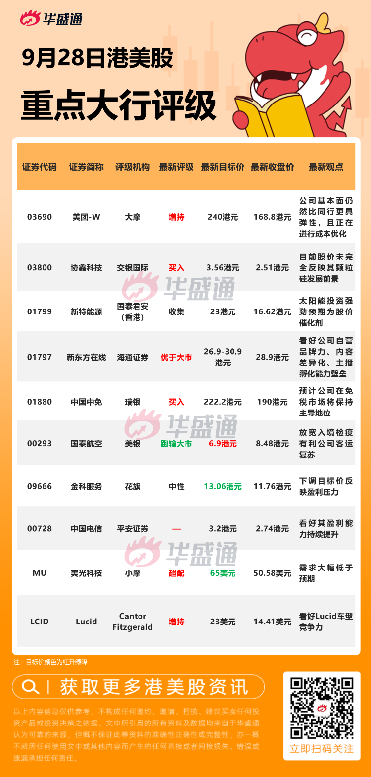 大摩发布研究报告称,维持美团-W“增持”评级,目标价240港元,重申为行业首选。公司基本面仍然比同行更具弹性,并且正在进行成本优化。报告中称,受惠于外卖业务量同比增长17%,及IHT(到店、酒店及旅游)业务收入增长14%,维持对集团第三季度核心本地商务收入的预测。
