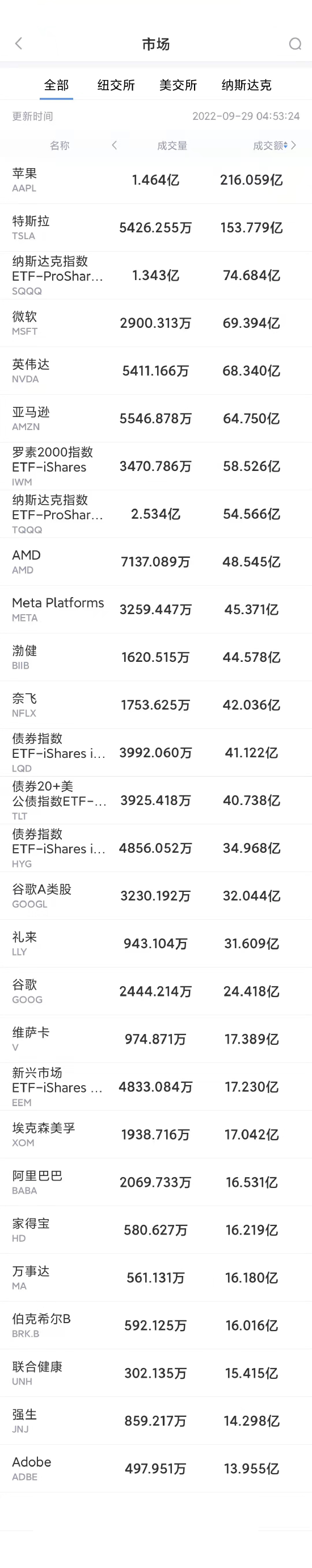 周三美股成交额冠军苹果公司收跌1.3%,成交216.1亿美元。有多家外媒报道称,苹果公司获悉iPhone 14需求低于预期后,准备放弃内部拟定的高达600万部的增产计划。