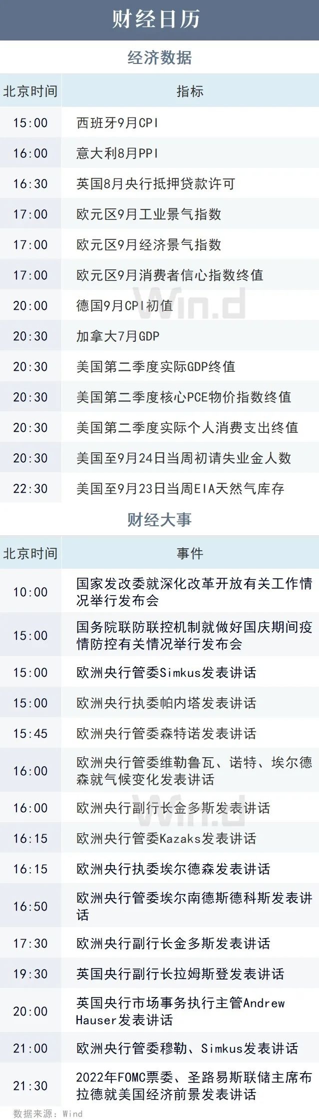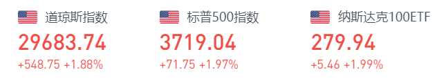 截至9月28日周三收盘,道指涨546.77点,涨幅为1.88%,报29681.76点;纳指涨222.13点,涨幅为2.05%,报11051.64点;标普500指数涨71.38点,涨幅为1.96%,报3718.67点。