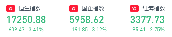 截至9月28日周三收盘,恒生指数跌3.41%,报17250.88点;国企指数跌3.12%,红筹指数跌2.75%。恒生科技指数跌3.85%,哔哩哔哩跌5.65%,京东跌5.63%,快手跌5.08%。