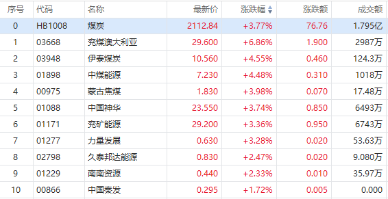 港股煤炭板块全员走高,截至发稿,兖煤澳大利亚(03668)涨6.86%,兖矿能源(01171)涨3.36%,伊泰煤炭(03948)涨4.55%,中国神华(01088)涨3.74%。