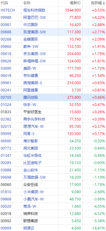 成分股中,阿里巴巴 -SW涨超4%领涨科网股,中芯国际涨超2%,百度集团-S、京东集团-SW、美团-W、哔哩哔哩-SW涨超1%。