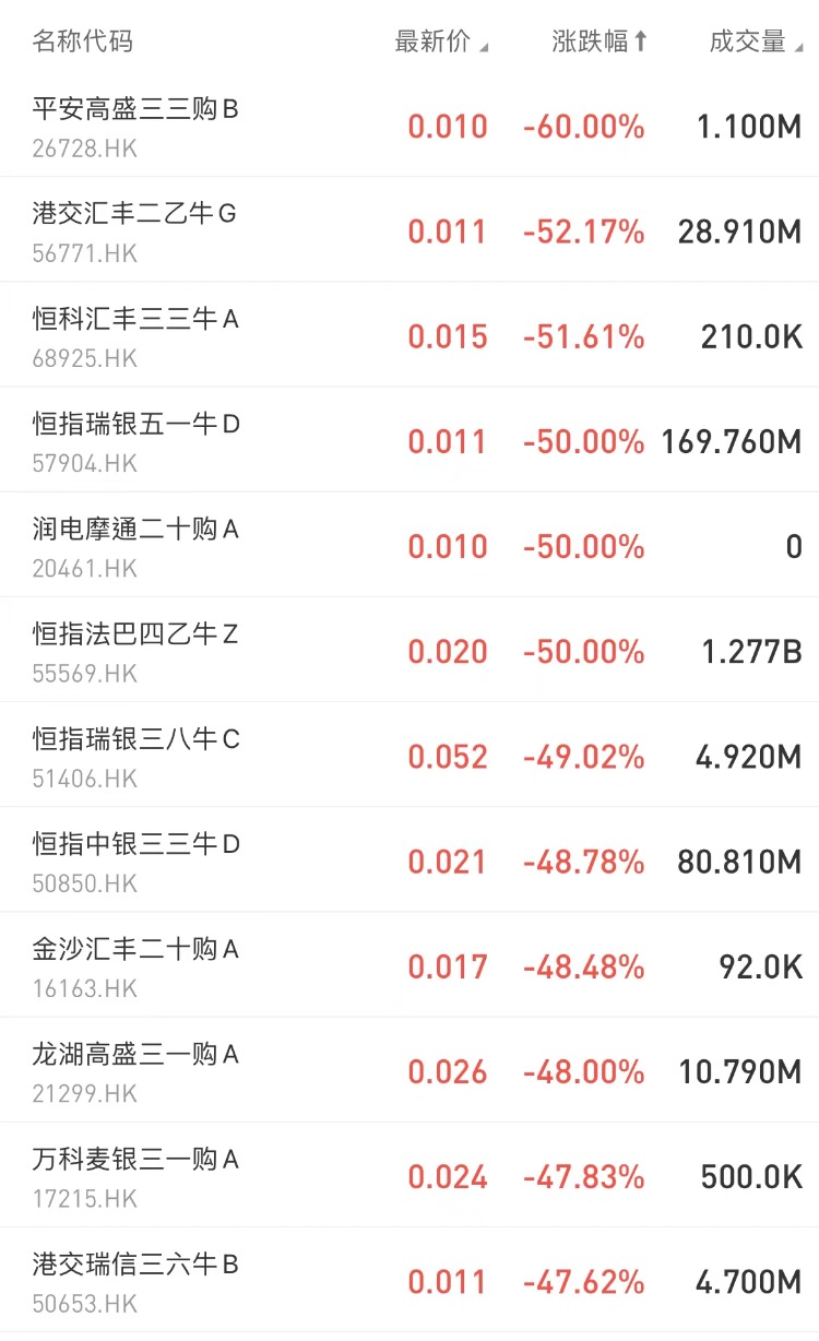 在今日跌幅榜中,平安高盛三三购B跌60%,港交汇丰二乙牛G跌52.17%。