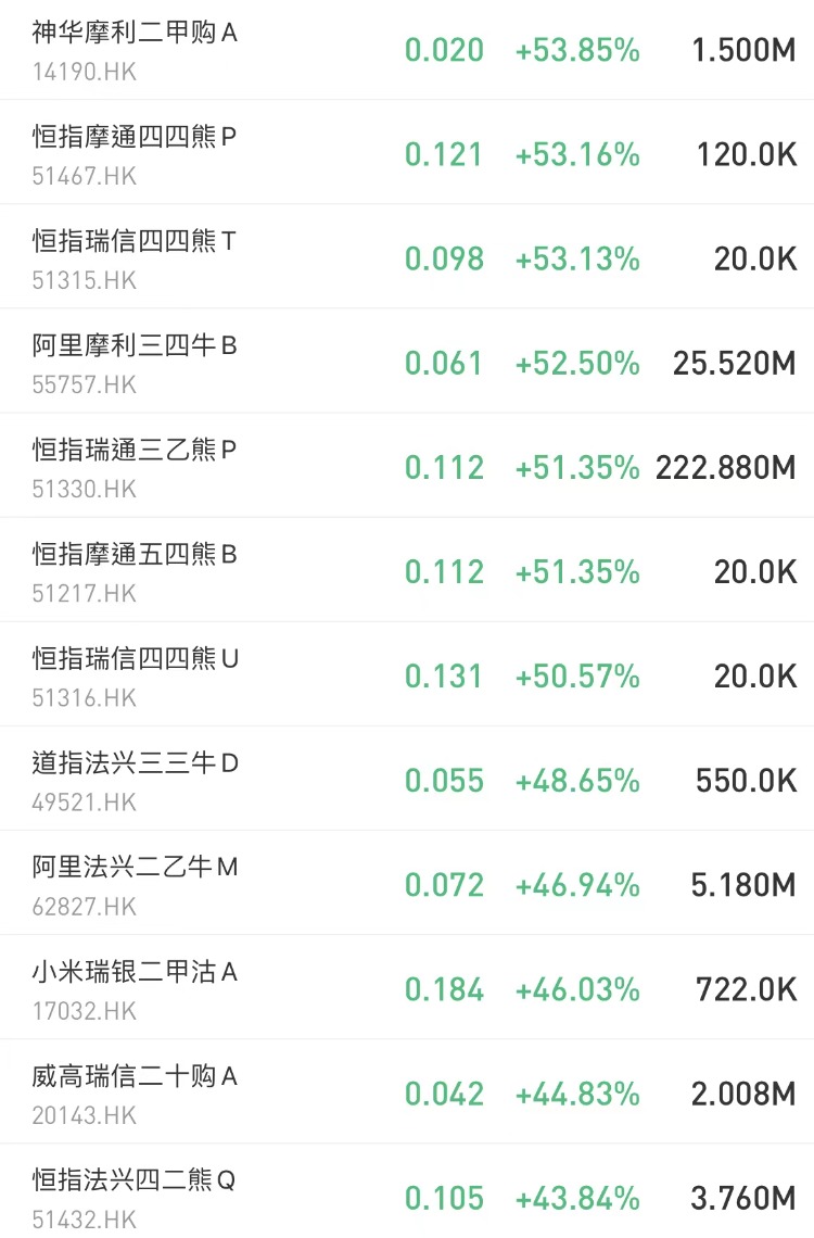 在今日涨幅榜中,阿里摩通三六牛F涨92.59%,神华摩利二甲购A涨53.85%,此外,小米瑞银二甲沽A涨46.03%。