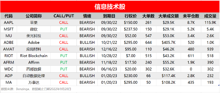 重点动态:美光科技于9月30日到期、行权价52美元的末日CALL出现一笔547张成交大单,总成本5.3万美元。该期权链接近到期日成交量拉升,周四收盘将发布业绩,市场预期不高,看空情绪较为浓厚。