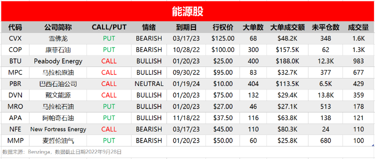 重点动态:周三能源股反弹,多只个股期权成交活跃。康菲石油、Peabody Energy、巴西石油公司等出现异动大单,大单成交额超过10万美元。