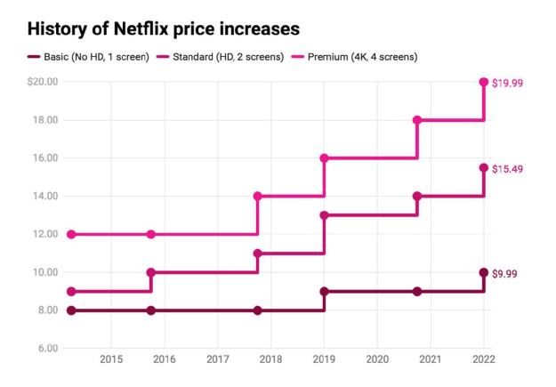 Netflix今年早些时候也提高了订阅价格。现在,Netflix向用户收取的月费高达19.99美元,这对流媒体服务来说是一个重大变化。下图概述了Netflix的价格历史: