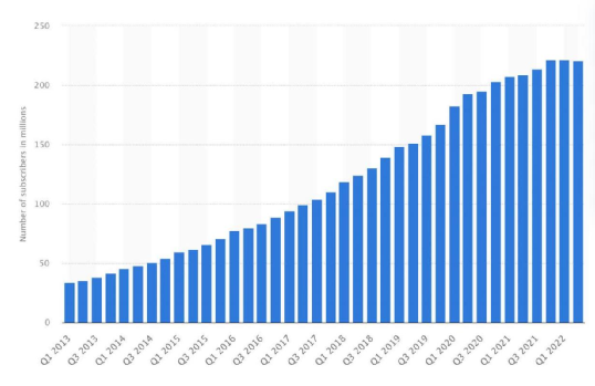 我们预计Netflix的订阅增长与大流行时期相比将放缓。Netflix从2020年的1.929亿用户增长到2021年的2.197亿用户。相比之下,Netflix在22年第二季度只增长到2207万。我们预计该公司不会看到在大流行中享有的同样的订阅增长。下图概述了从2013年到22年第2季度全球Netflix付费用户的数量。
