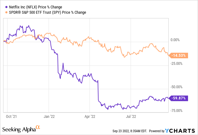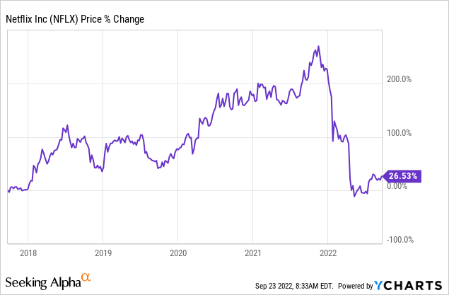 在过去12个月里,Netflix的股票下跌了约60%,而标准普尔500指数相比之下下跌了约15%。在过去五年里,Netflix升值了约27%。Netflix在大流行期间飙升,在2020年和2021年之间升值了167%。