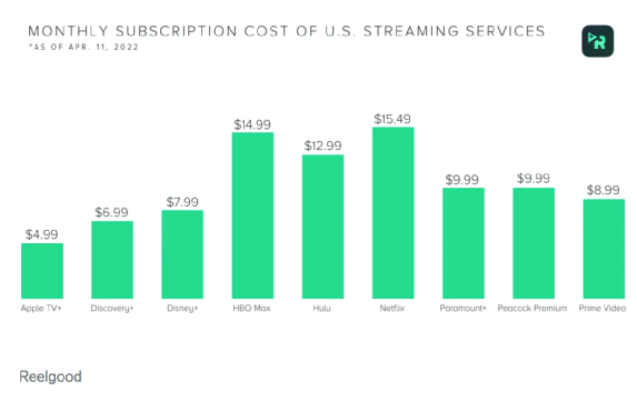 下图显示了美国顶级流媒体服务的每月订阅费用:
