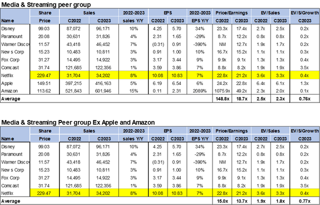 我们认为Netflix很贵,交易价格是2023年市盈率的21.3倍,而纯粹的同行平均价格是13.8倍。