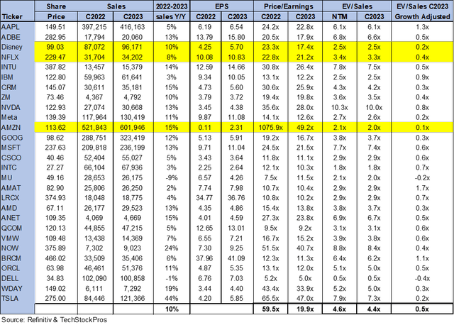鉴于竞争的加剧,我们认为Netflix的股票价格过高。按市盈率计算,Netflix目前的交易价格是2023年每股收益10.83美元的21.2倍,而同行的交易价格是18.7倍。从EV/Sales来看,Netflix的C2023年销售额是3.3倍,而同行平均为2.3倍。我们预计未来会有更多的下跌空间。