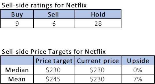 在43位分析师中,28位持有评级,9位买入评级,6位卖出评级。Netflix目前的交易价格为230美元。目标价的中位数是230美元,目标价的平均值是245美元,潜在上升空间高达6%。下图显示了NFLX的卖方评级和目标价格: